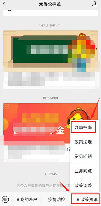 关注微信公众号“无锡公积金”,选择菜单栏“政策咨询”,点击“办事指南”