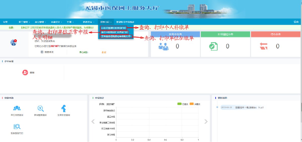 报表打印可以查询个人补缴单、单位正常申报人员明细、正常申报征缴单。