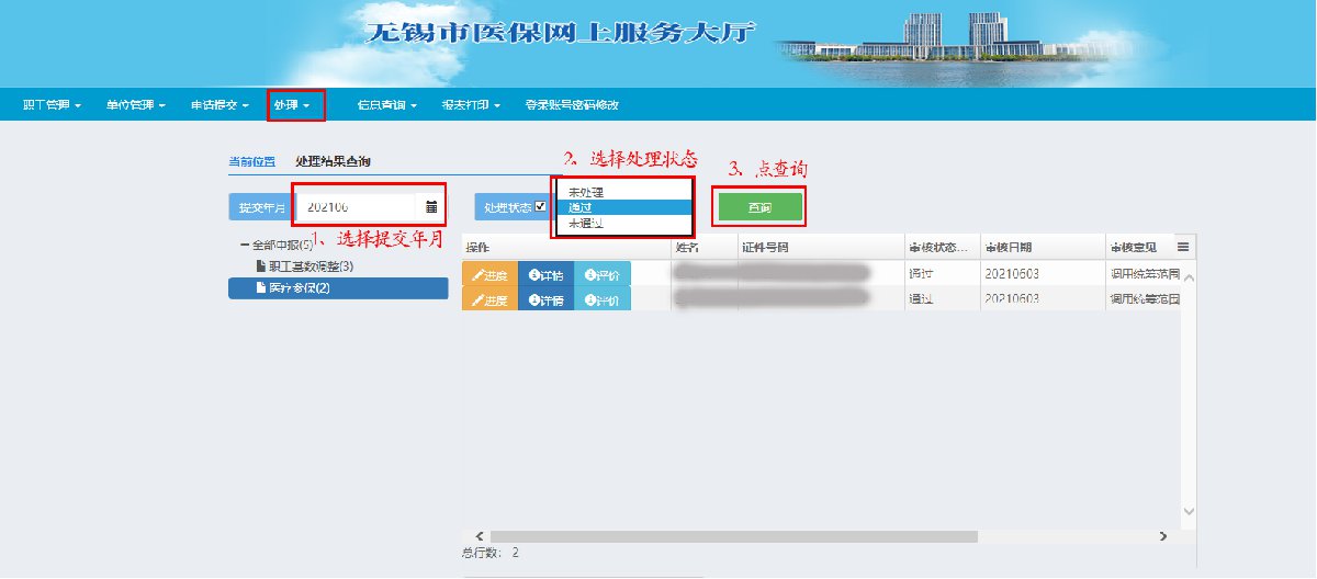 在“处理” 模块选择“提交年月”、“处理状态”查询审核结果
