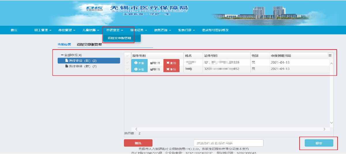待提交申报管理可看见单位所有待提交项,可以对提交项进行管理,选中继续提交或者删除,修改等操作。