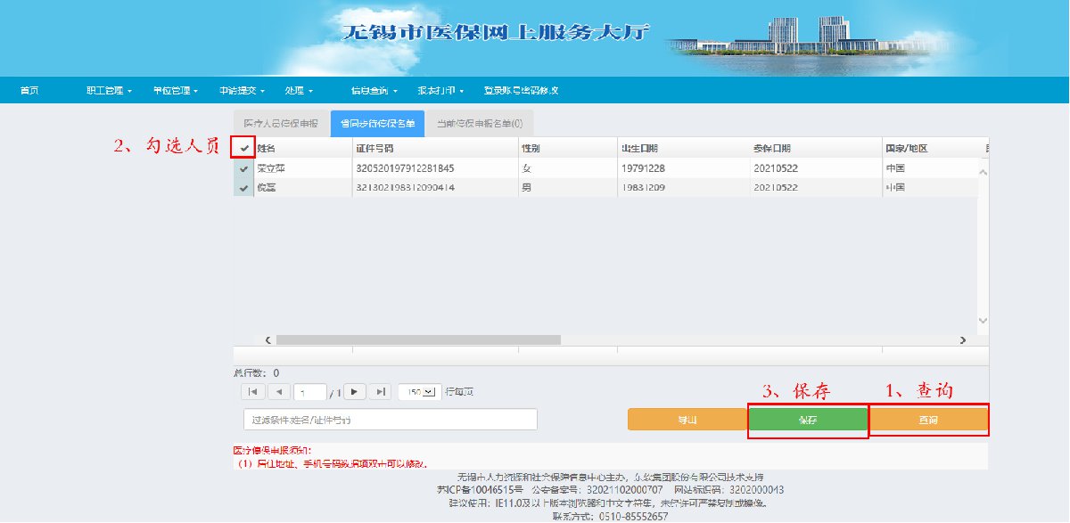 第3步:点击菜单“职工管理”—“医疗停保” —“省同步待停保名单”,先点击“查询”,然后勾选人员,再点击“保存”;若在“省同步待停保名单”中查询不到的人员,则到“医疗人员停保申报”界面填写人员信息后(红色都为必填项),点击“确定”;