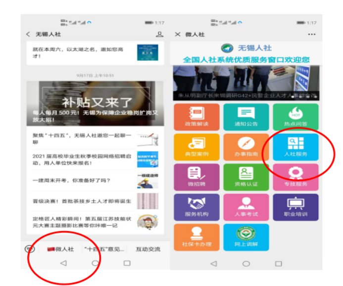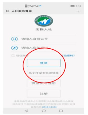 第一步,申请人登录手机微信,关注“无锡人社”微信公众号,点击“微人社”进入“人社服务”。