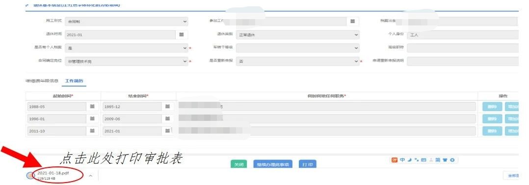 4、完善相关信息后点确认提交,提交后点打印,打印三张表,职工本人签字,单位盖章后,由单位经办人员携带职工档案前来政务中心人社一门式窗口办理(地址:江阴市长江路188号政务服务中心)。(建议单位缴费到账后进行网上退休申报,申报后尽快将档案送达人社窗口,同时单位需为该退休人员办理退工登记,退工登记原因选择达到法定退休年龄)。