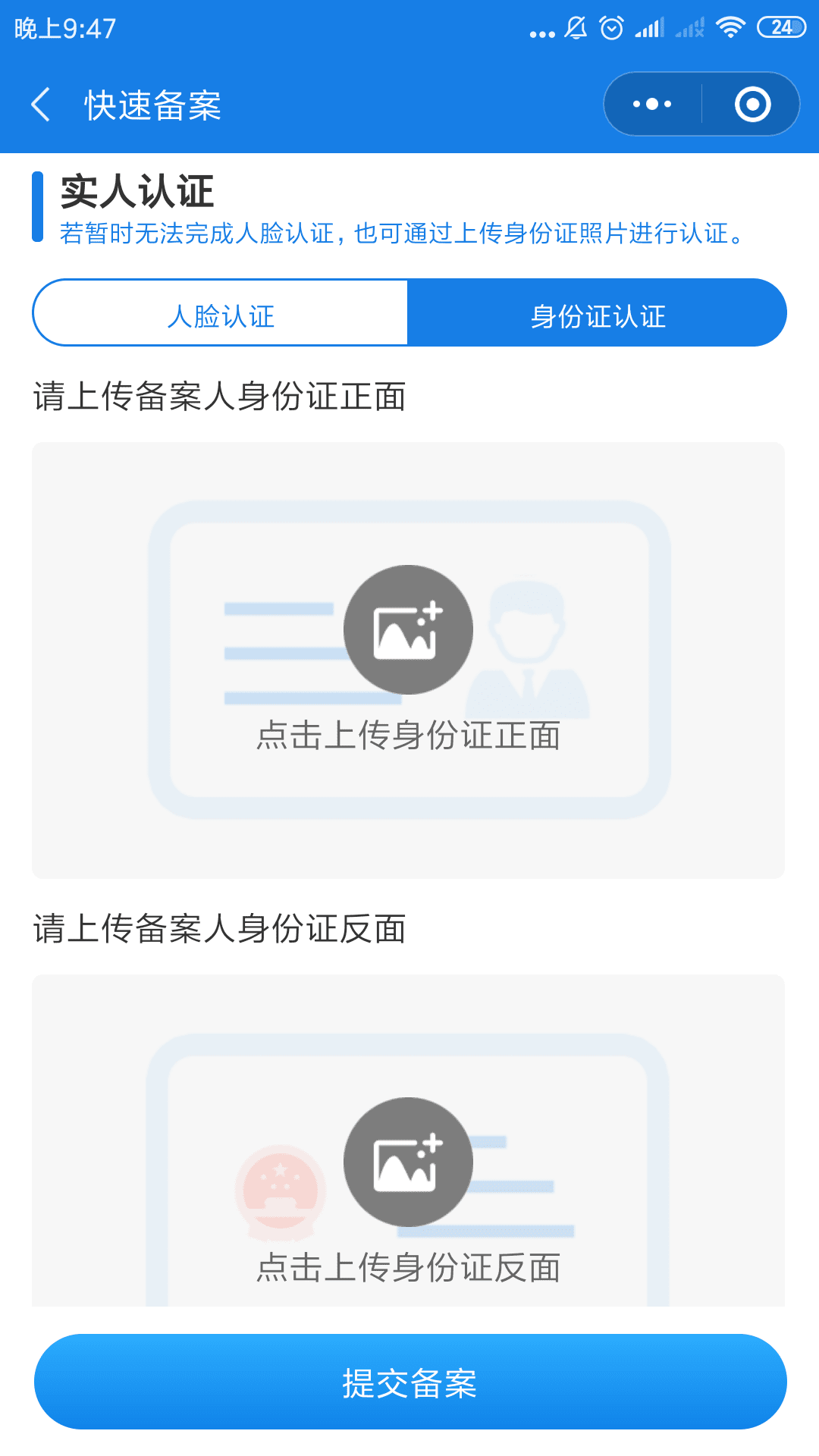 ④ 为他人备案需要 备案人实人认证 ,可直接通过 人脸认证 或者 上传备案人身份证正反面 进行认证,认证成功后提交备案。
