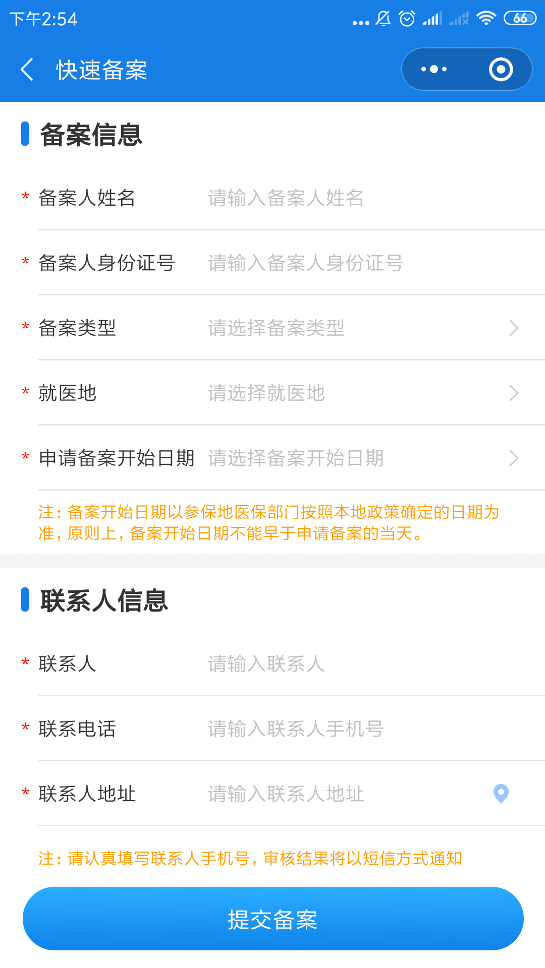 ① 点击【 为自己备案 】,选择参保险种与参保地,确认进入申请页面。