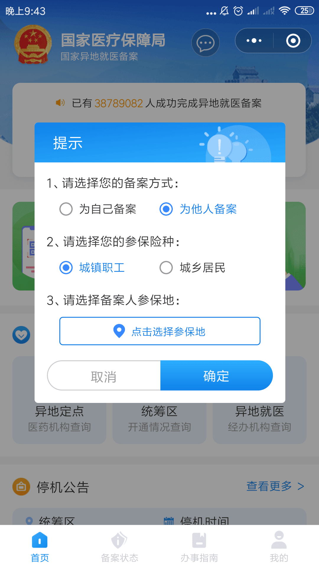 ① 点击【 为他人备案 】,选择备案人的参保险种与参保地,确认后进入申请。