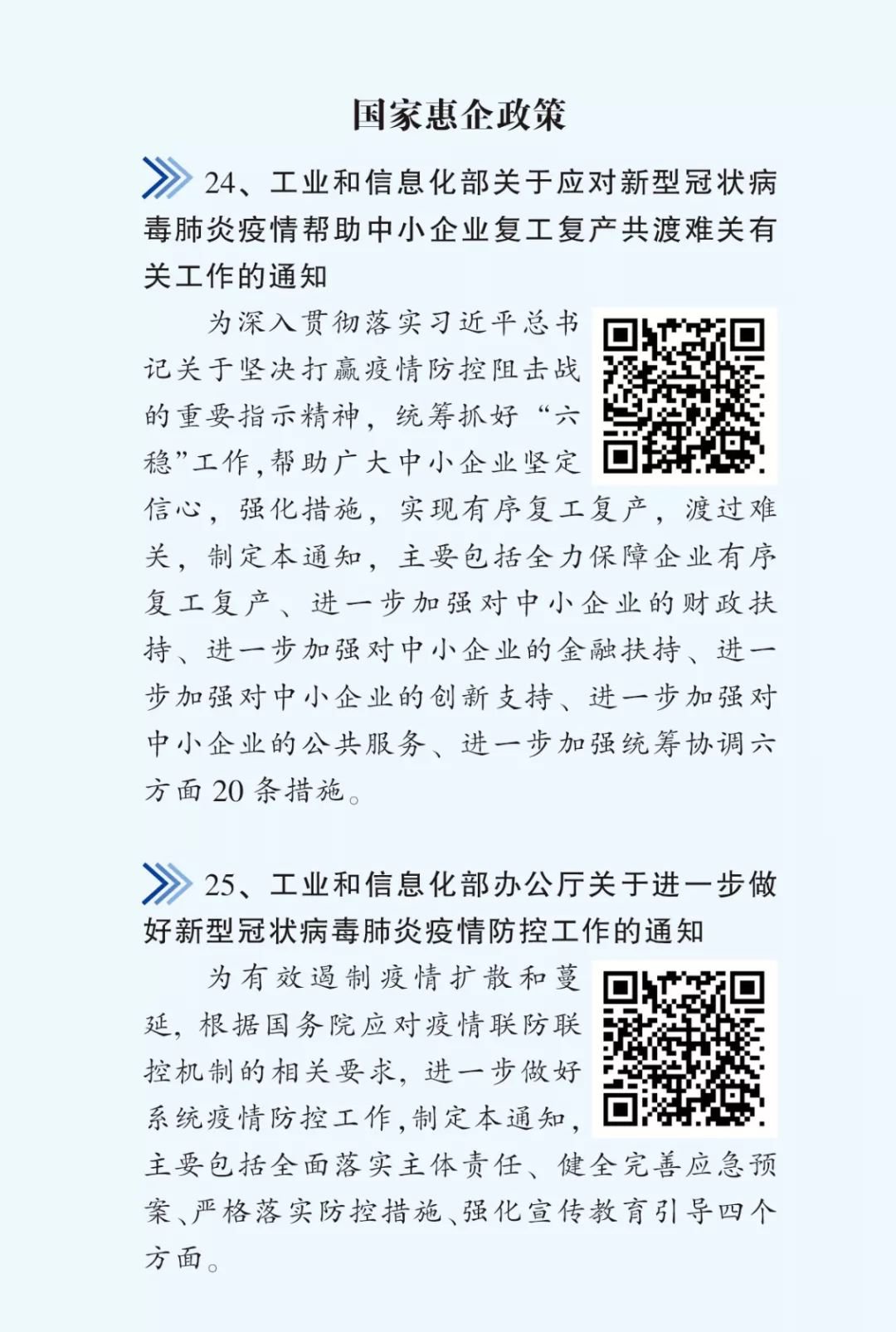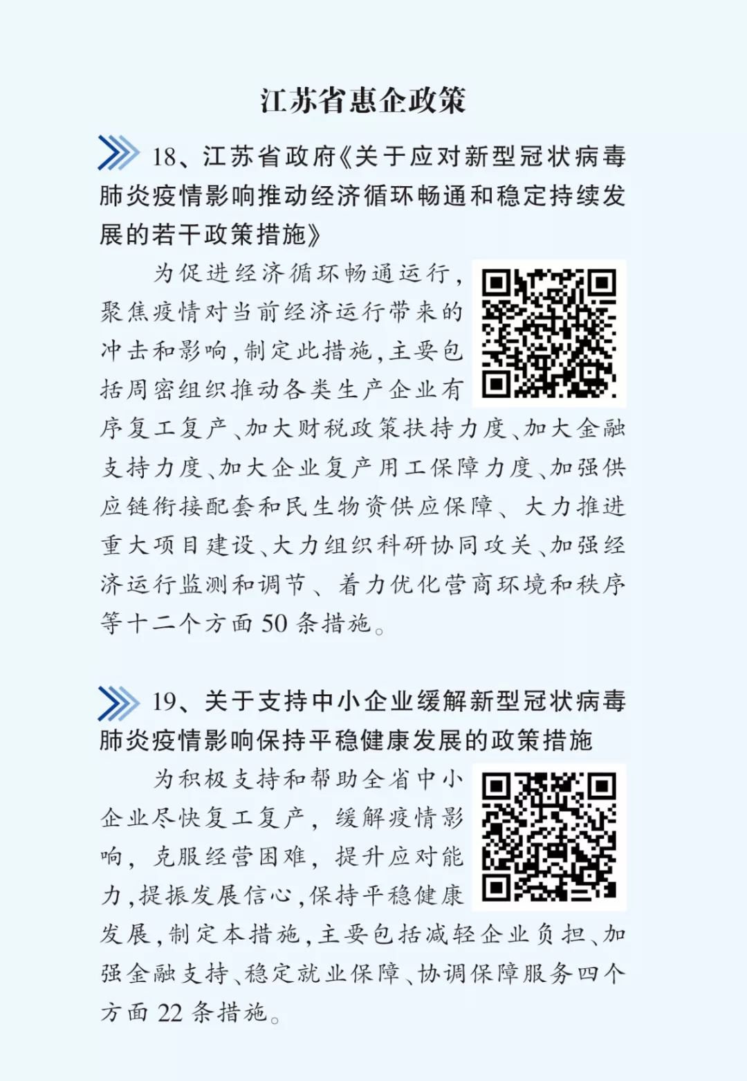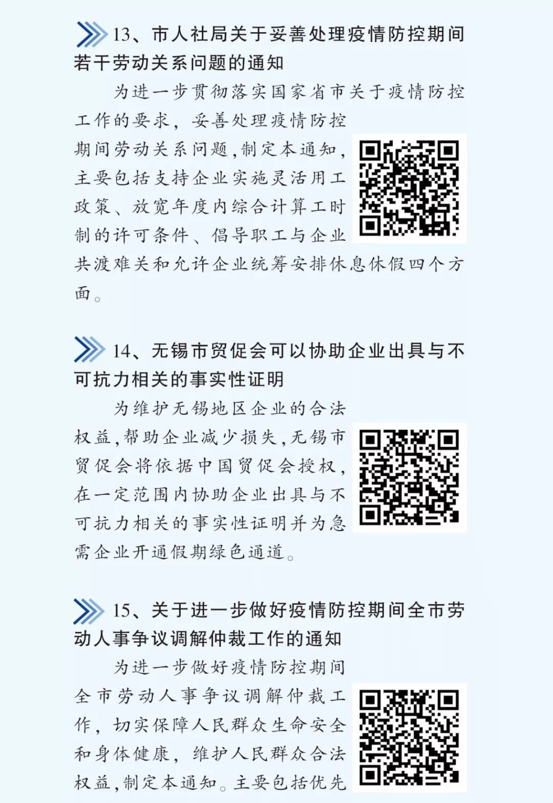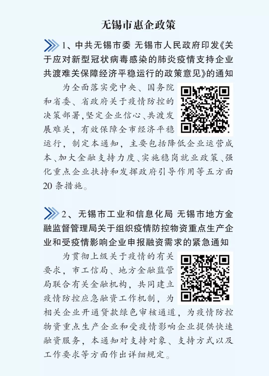 此速查手册是《疫情防控期间国家、省、市惠企政策汇编》的索引目录,汇编收录国家、江苏省、无锡市在疫情防控期间出台的惠企政策,共40篇。为方便企业快速理解掌握政策要点,我们对各项政策名称进行规范表述,摘编了政策的主要内容,并将政策同步上传到“无锡市企业服务云平台”,企业可以通过扫描每项政策的“二维码”,阅读详细内容。