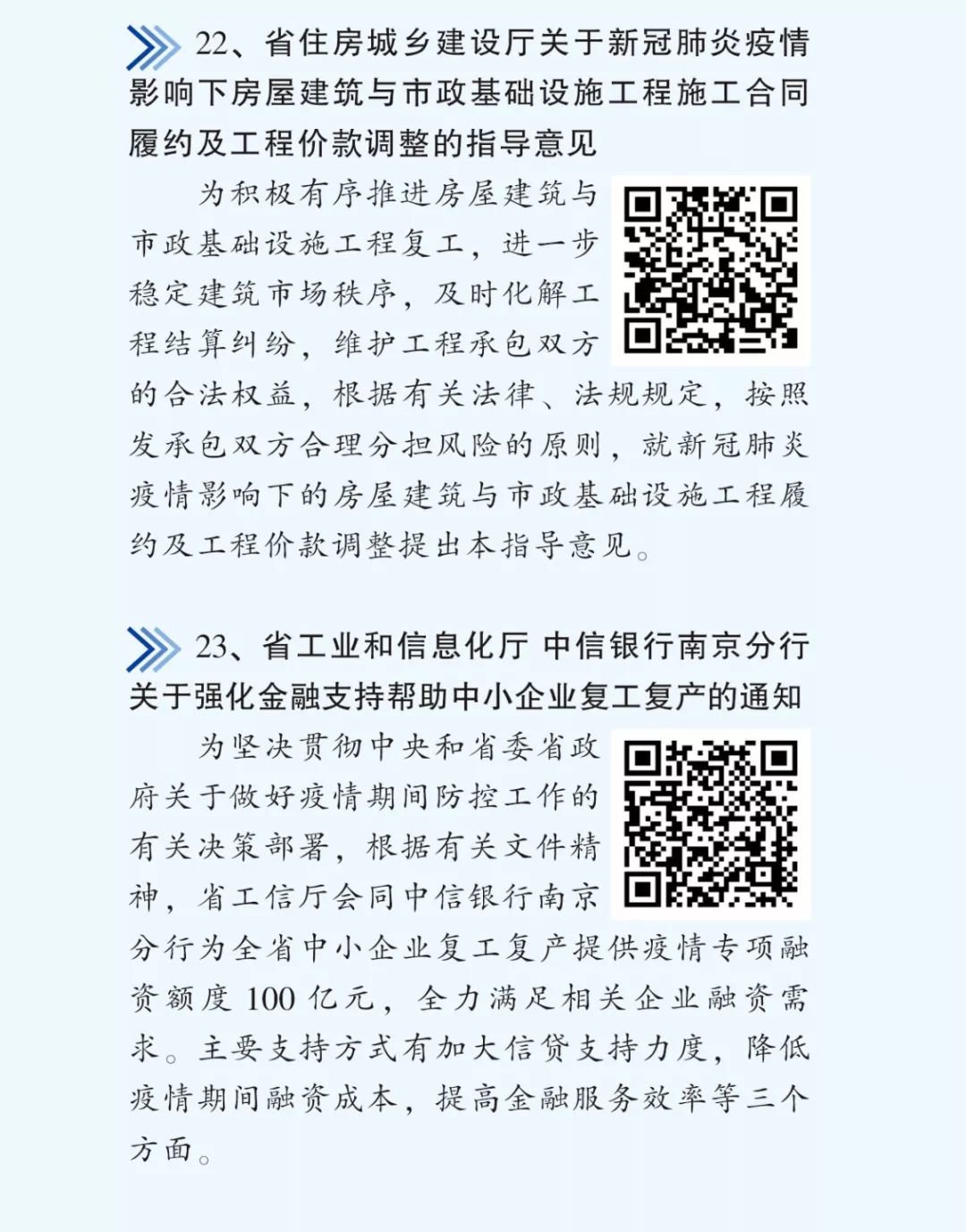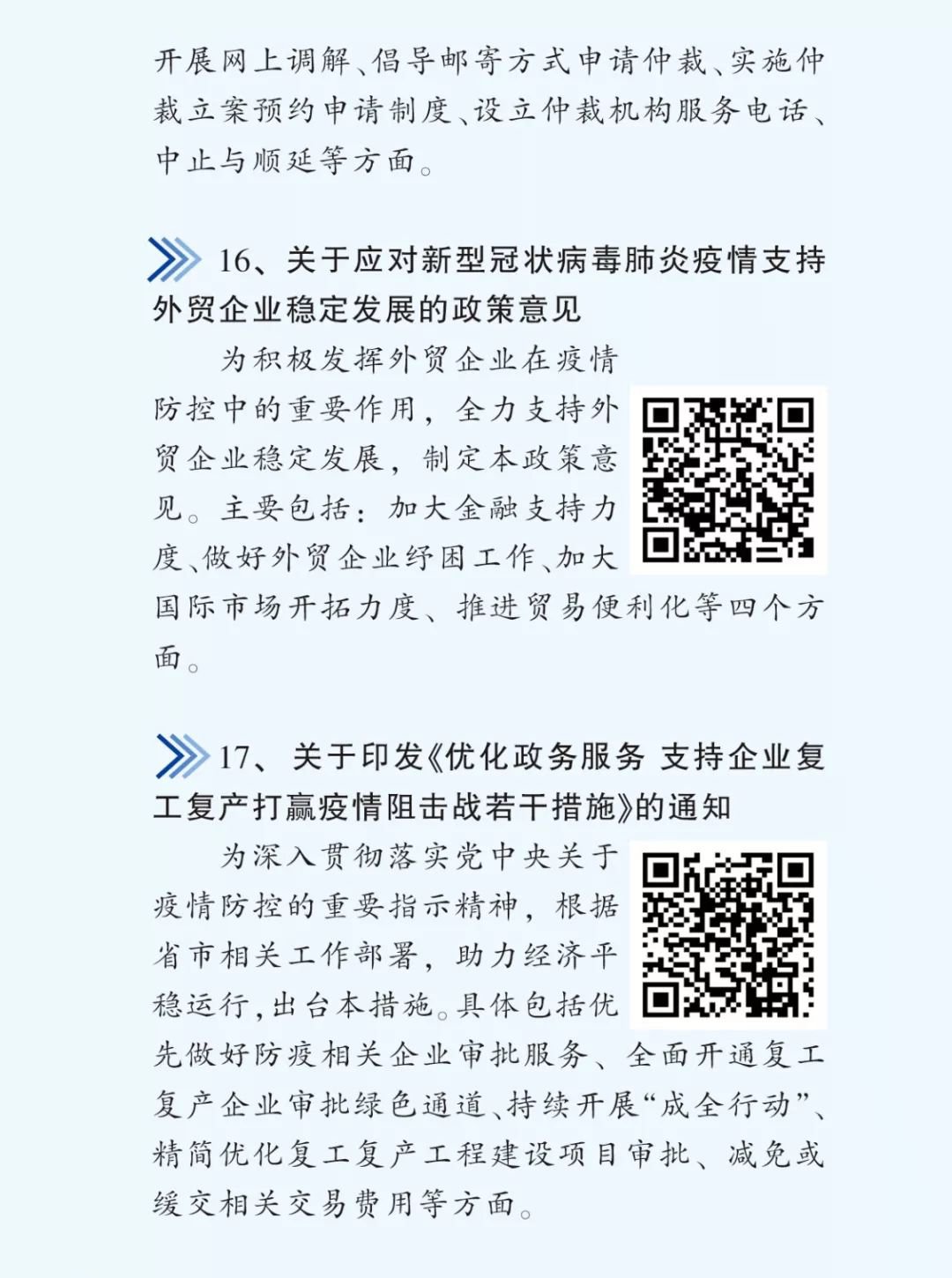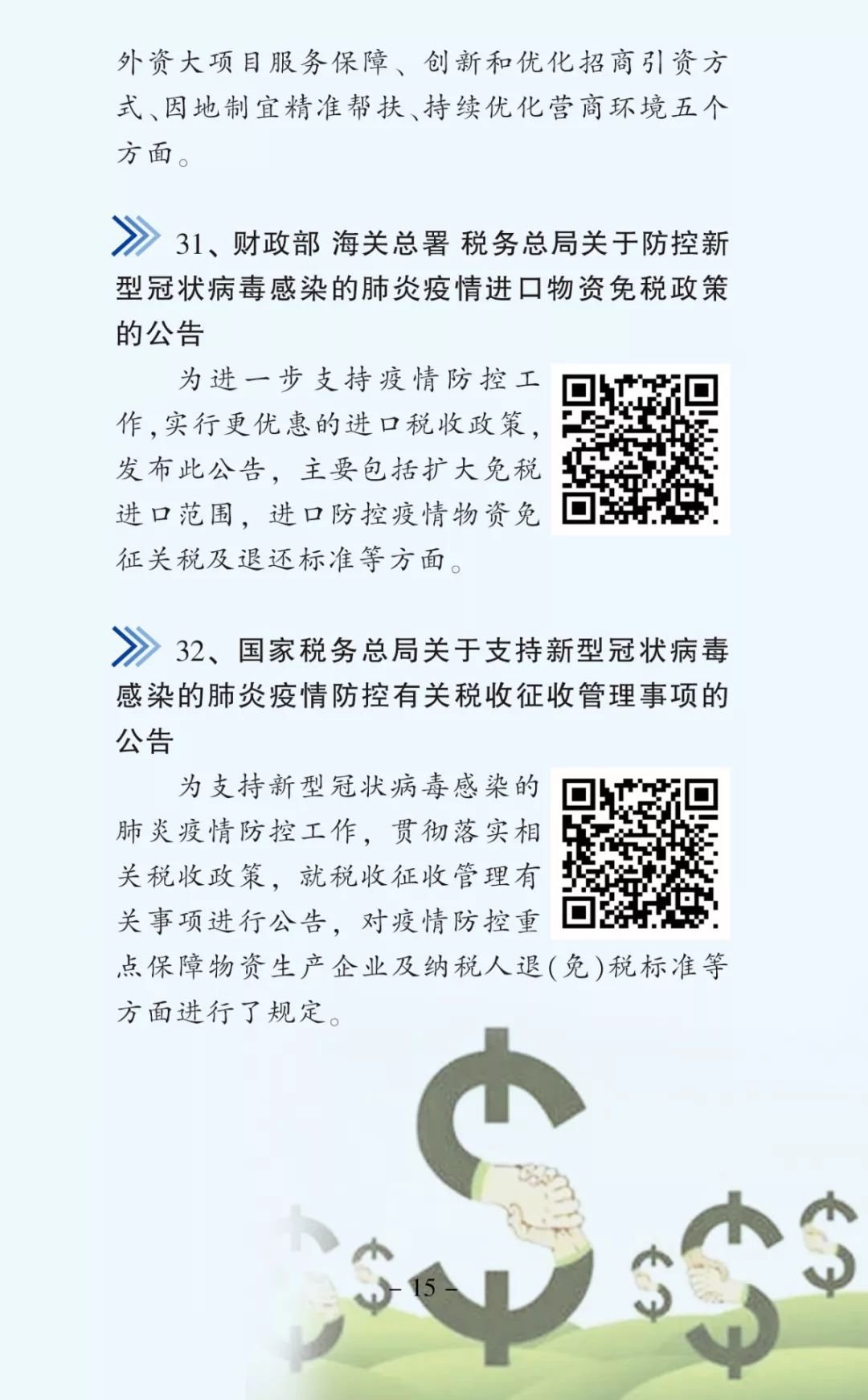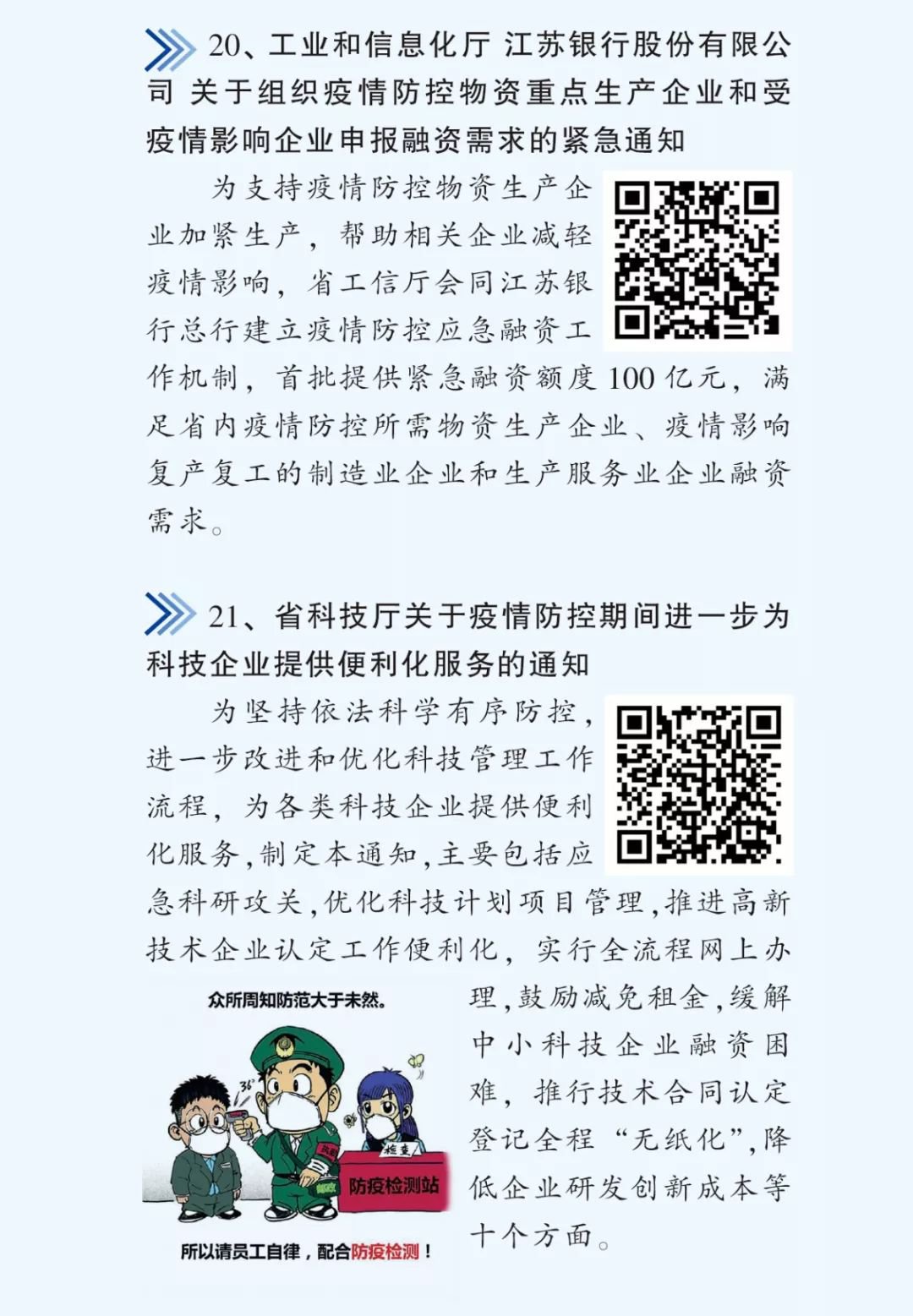 此速查手册是《疫情防控期间国家、省、市惠企政策汇编》的索引目录,汇编收录国家、江苏省、无锡市在疫情防控期间出台的惠企政策,共40篇。为方便企业快速理解掌握政策要点,我们对各项政策名称进行规范表述,摘编了政策的主要内容,并将政策同步上传到“无锡市企业服务云平台”,企业可以通过扫描每项政策的“二维码”,阅读详细内容。