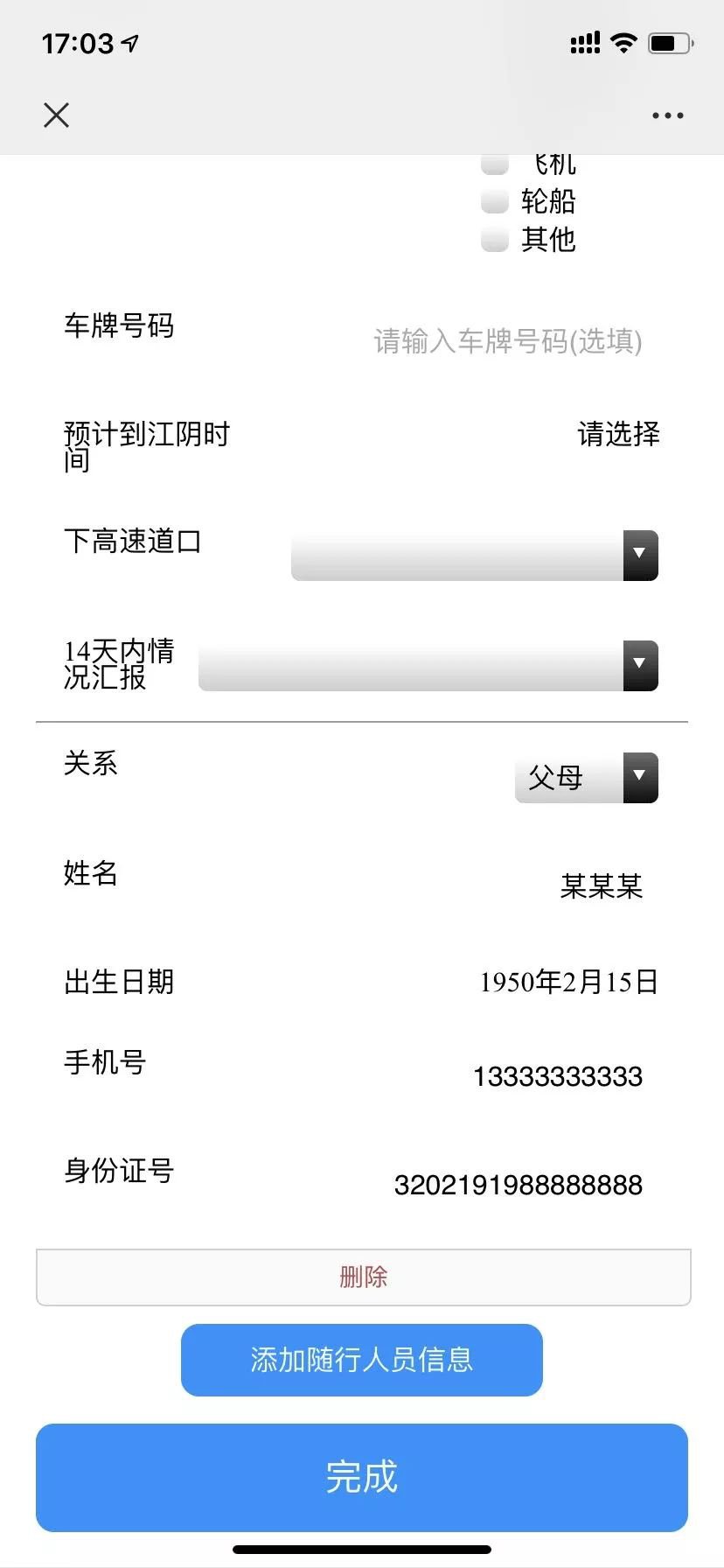 如果您有随行人员(夫妻、父母、子女),请添加随行人员信息,点击“添加随行人员信息”按钮,会出现信息填写框,请务必填写完整随行人员身份证号码,信息填写完毕请提交。