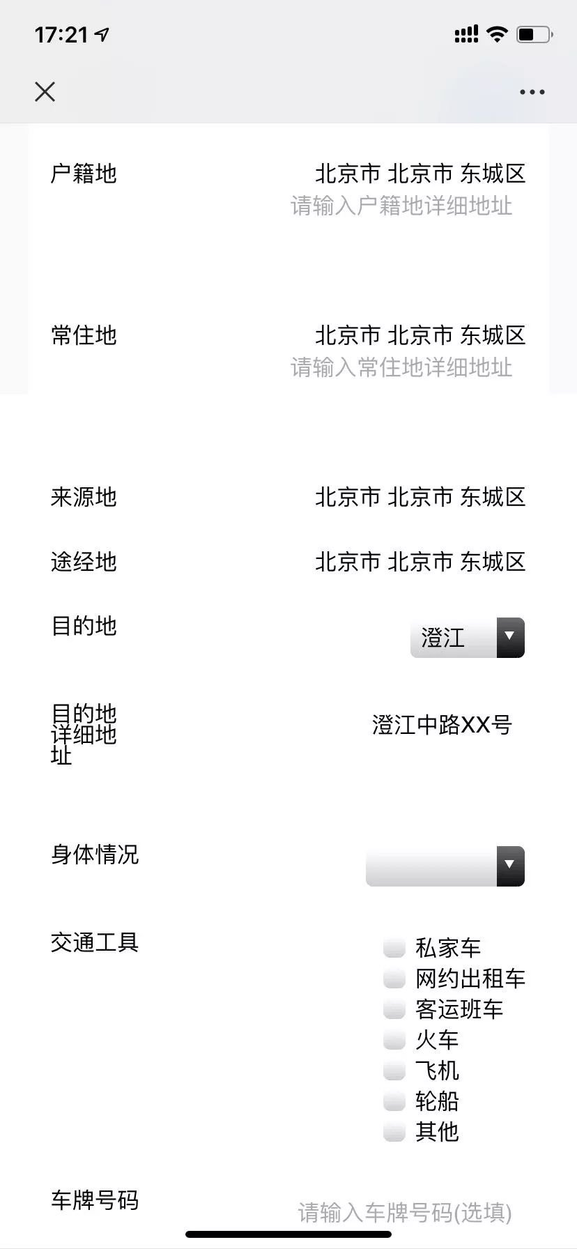 如实选择自己的户籍地、常住地、来源地、途经地和目的地,填写目的地详细地址,选择自己的身体情况、来澄使用的交通工具,如有开车或者乘坐汽车,请填写车牌号码;填写预计到达江阴的时间,路径规划的高速道口,并填写14天内情况,完成提交即可。个人申报流程到此结束。