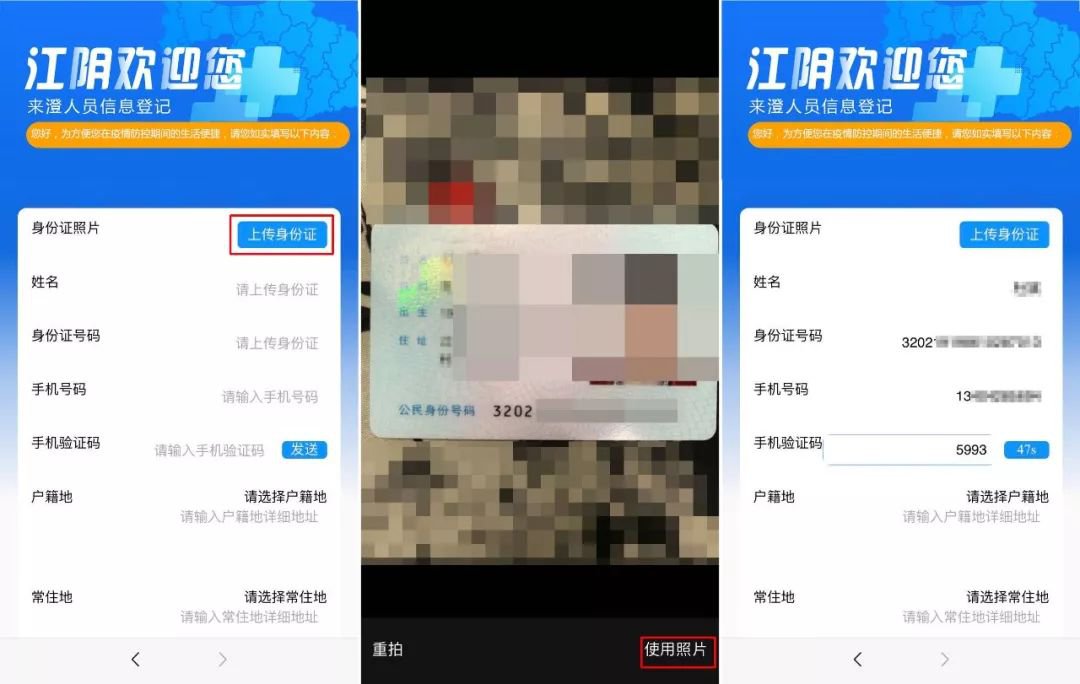 进入个人登记后,请按照页面的提示要求,上传身份证照片,系统会自动识别姓名和身份证号码,然后请输入自己的手机号码,接收验证码后正确填写验证码。