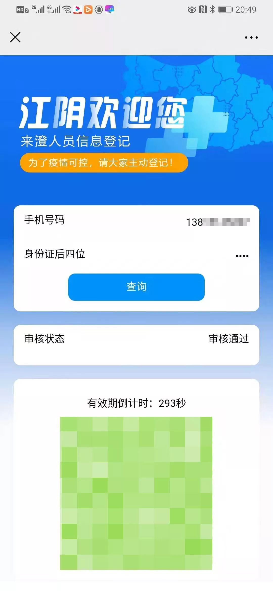 如果您的申请通过了,则进入查询个人登记,输入手机号和身份证号码后四位查询自己的二维码,查询成功如下图。