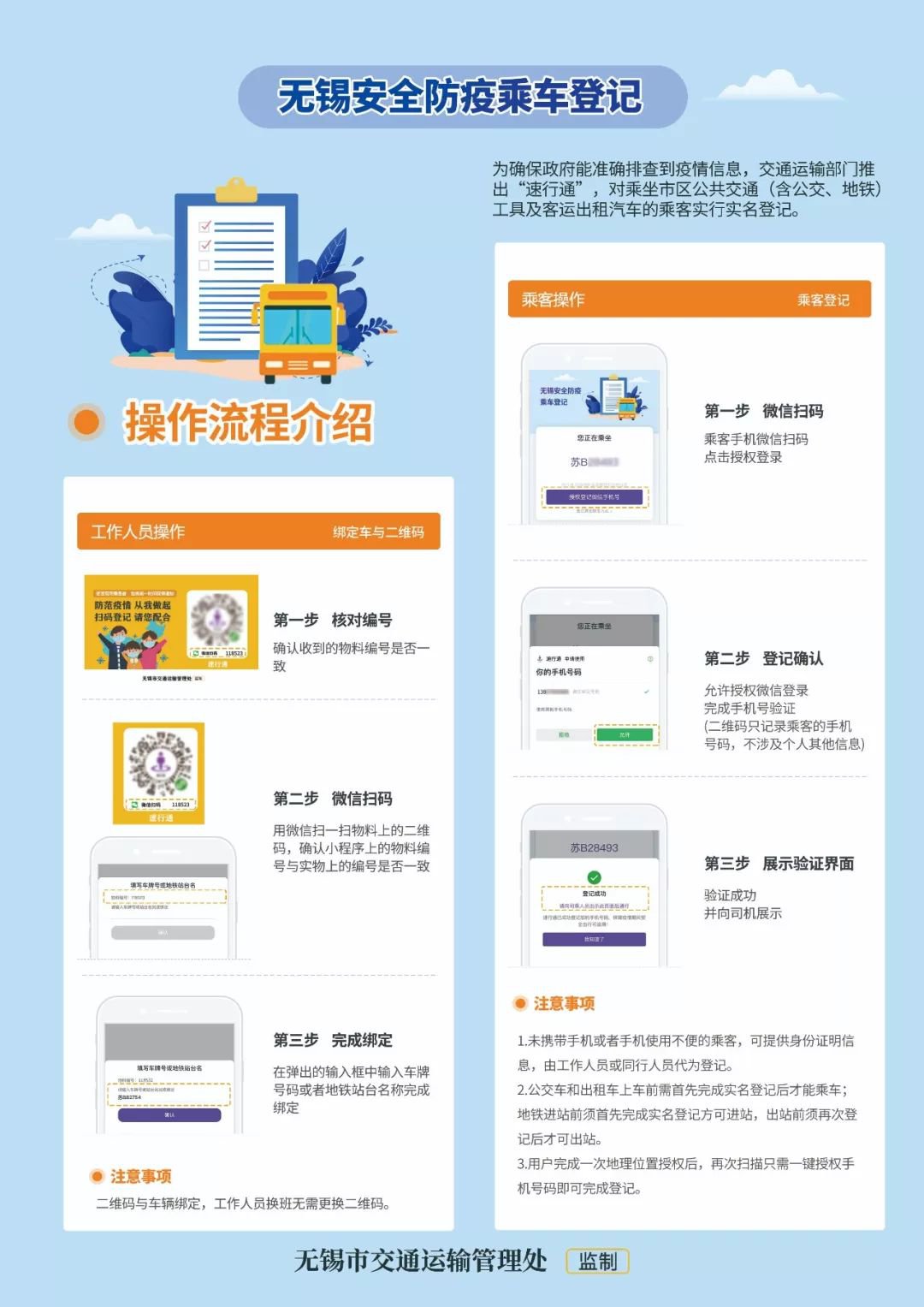2月18日起,无锡市区范围内乘坐公交、地铁和出租汽,全面实行实名登记。乘客在乘坐公交、地铁及出租汽车上车前,应主动使用手机微信扫描张贴在车辆或指定位置的“速行通”二维码进行登记,登记信息包含手机号码、车辆信息、位置信息、登记时间等出行信息,登记信息验证通过后方可乘车,对于未携带手机或手机使用不便的乘客,可提供身份证明信息由工作人员或随行人员代为登记,对于乘客信息,将会被严格保密,仅用于疫情防控期间对疑似病例和密切接触者的追踪和调查。