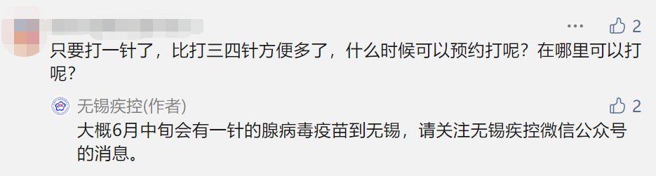 根据无锡疾控官方微信消息,无锡已经可以接种一针的腺病毒载新冠疫苗,大概6月中旬会有一针的腺病毒疫苗到无锡,后续本页面会持续更新,具体也可以咨询社区卫生服务中心>>>>