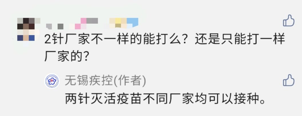 据无锡疾控官方消息,两针灭活疫苗不同厂家的均可以接种。