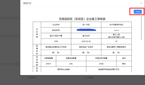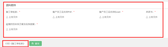 资料附件部分内容先暂不上传,点击“打印《复工审核表》”按钮。