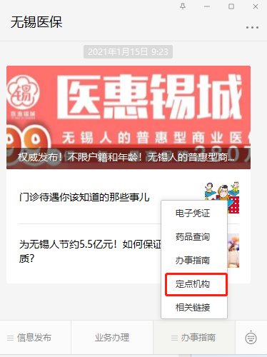 3.通过微信公众号查询,如无锡医保公众号下菜单栏可以查询定点医疗机构目录。