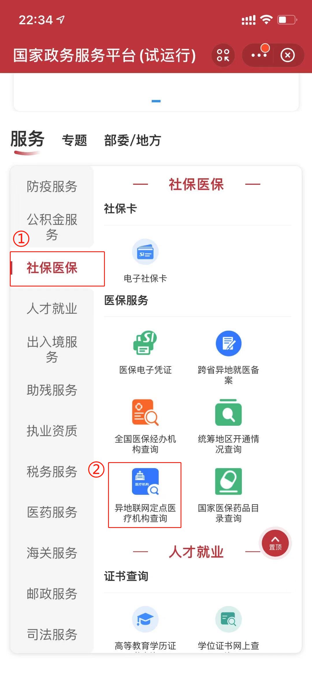 1)在支付宝搜索框内搜索【定点医疗机构】选择下拉框内的【国家政务服务平台】并进入。