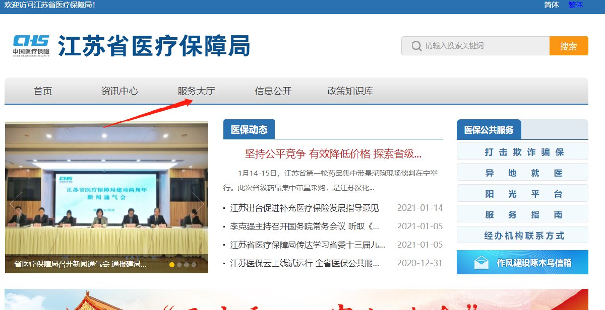 1)登录江苏省医疗保障局官网,点击菜单栏的【服务大厅】并进入。