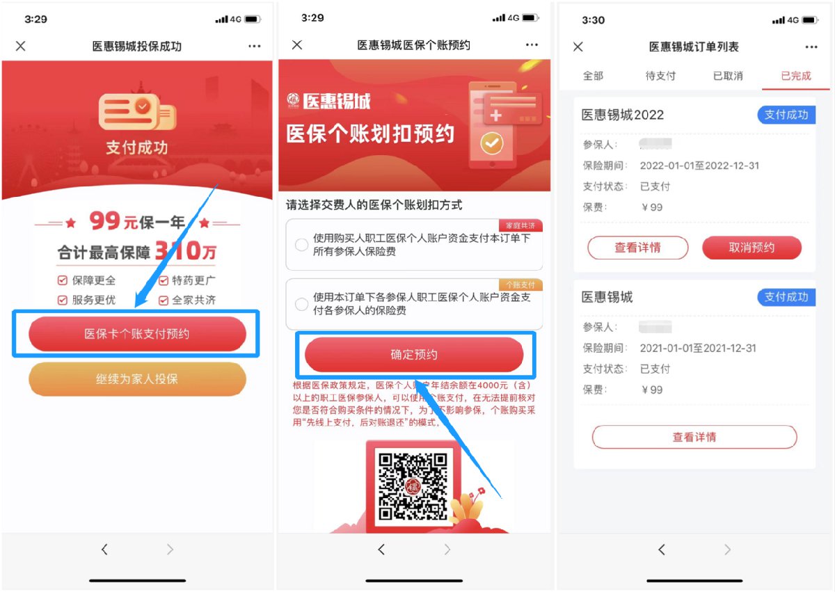 (3)预约成功后,后续经过审核,如符合条件即可由医保个人账户划扣保险费,您投保时先行支付的保险费将会通过原支付通道退回您的微信账户中。
