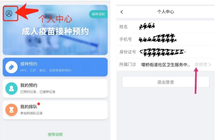(五)选择门诊下已开放预约的疫苗,没有的疫苗表示该门诊暂未开通该疫苗的预约。可更换门诊进行预约。(可通过点击个人中心——更改所属门诊)