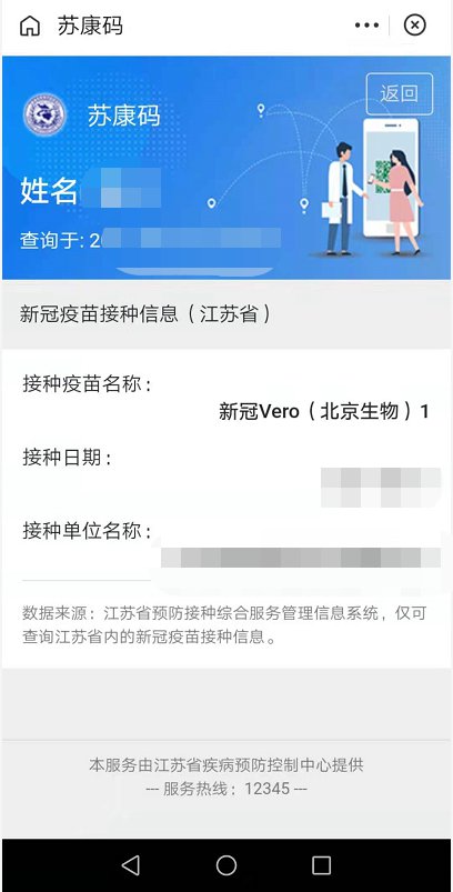 点击“新冠疫苗接种信息查询(江苏省)”即可查询接种信息:疫苗名称、接种日期、接种人群等