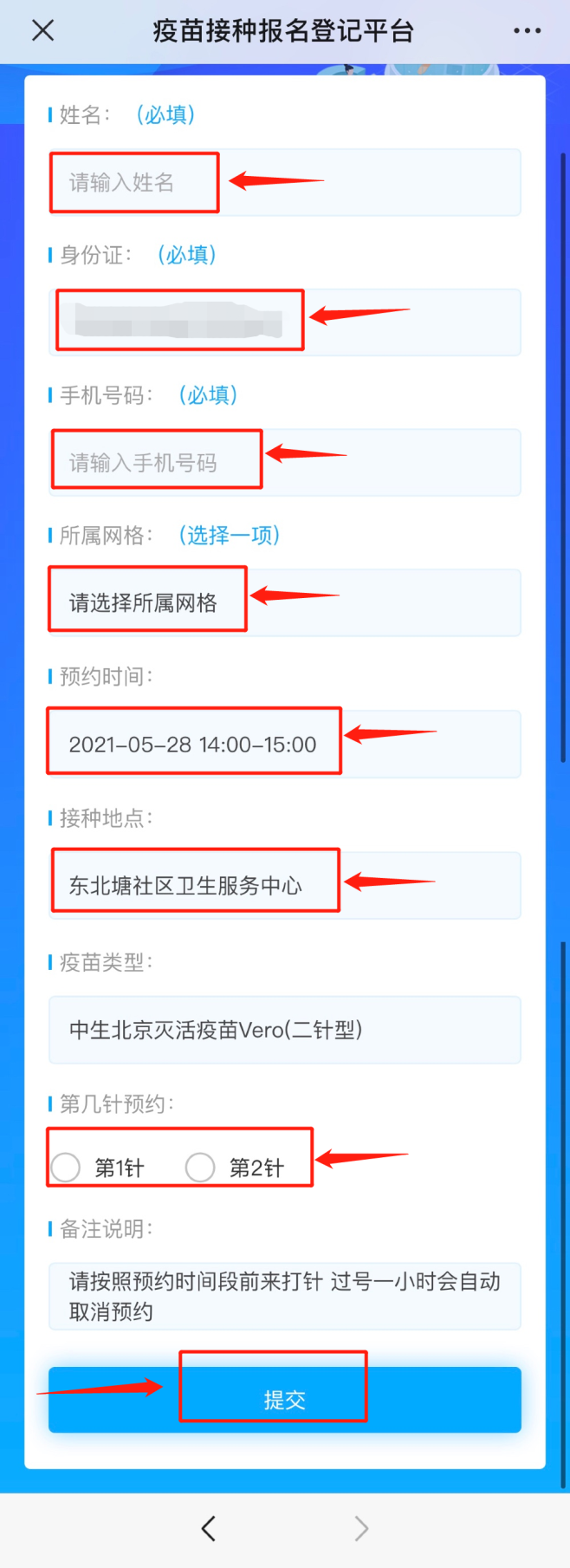 ➤ 按界面如实填写个人信息:姓名、身份证、手机号、所属网格(居住或工作的村社区)、预约时间(根据个人时间可进行选择)、接种地点、预约第几针等,核对信息无误后,点击“提交”,即预约成功!