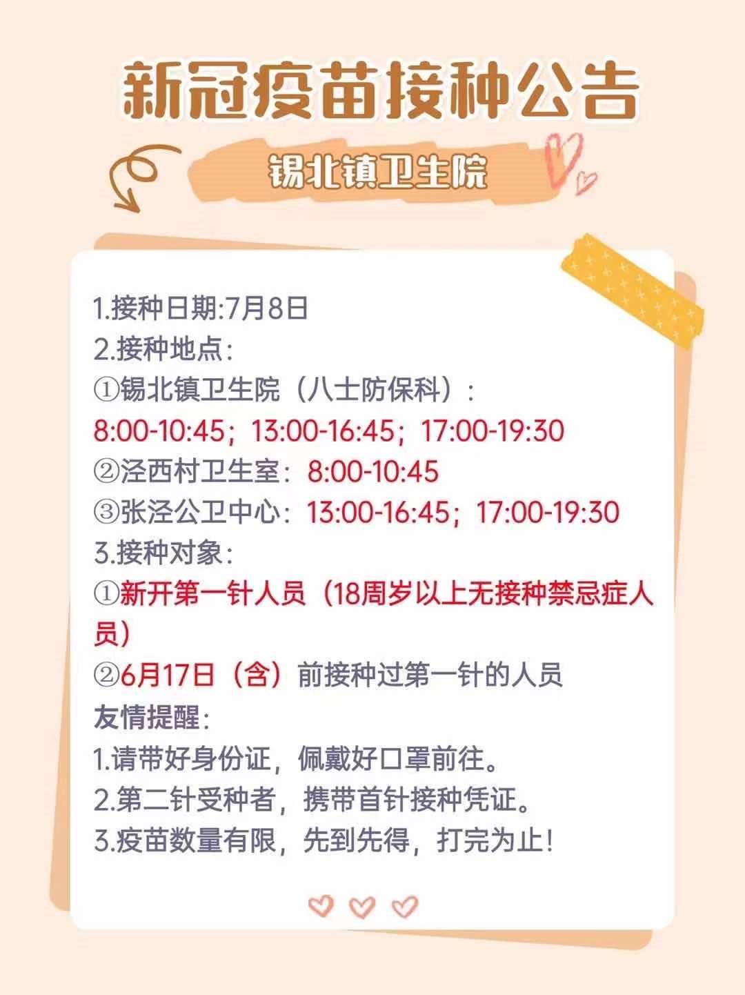 7月8日(星期三)有新冠疫苗可接种,主要为第一针进行接种,具体安排如下: