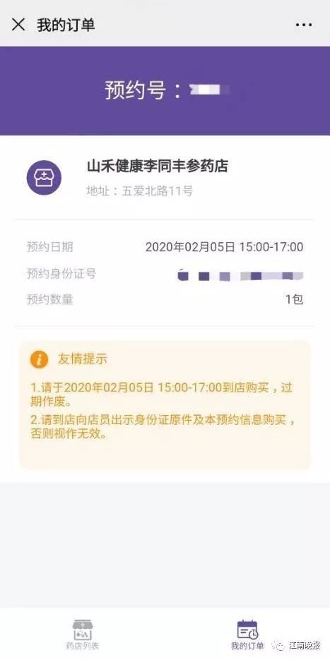 预约成功后,页面将提示次日去线下药店购买口罩的时间。次日在预约时间段内,凭预约身份证原件和预约号前往预约药店购买,过期作废。