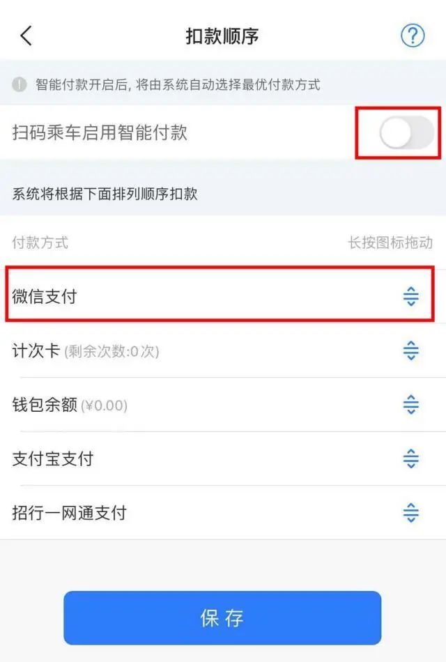然后在【乘车码】-【支付方式】页面,关闭智能支付,并将微信支付移动到第一位并保存。