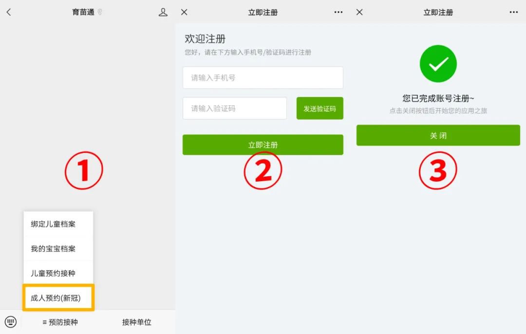 初次使用公众号,需要先完成注册,在下拉菜单“预防接种”中,选择“成人预约(新冠)”功能,完成账号注册。