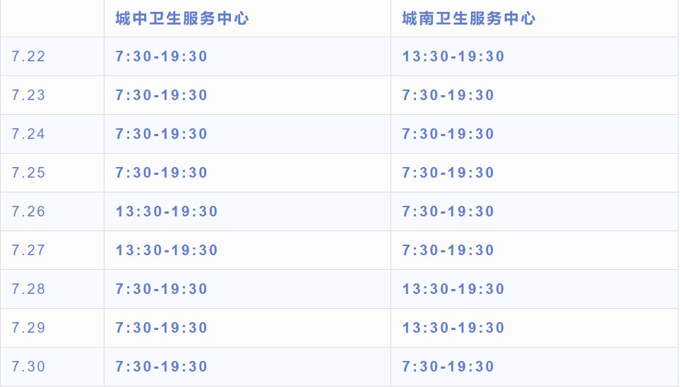 *为集中医护人员完成疫苗接种任务,7月17日至30日期间,城中社区卫生服务中心和城南社区卫生服务中心儿童门诊停诊。