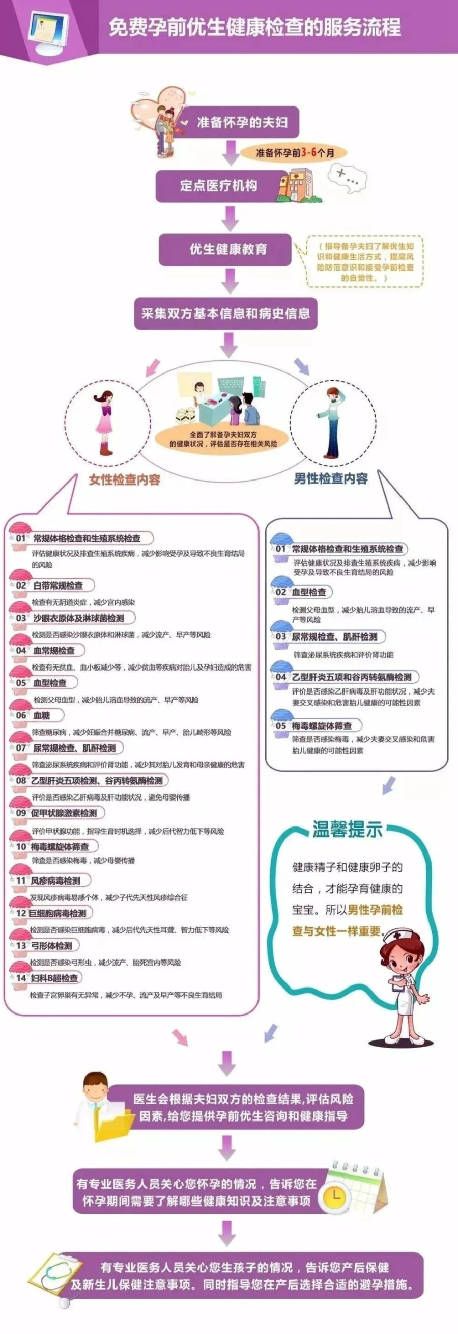 空腹检查,避开月经期,需双方参加。有意愿参加免费孕前优生健康检查的夫妇请提前和所属村(社区)妇女主任联系,报名预约参检。