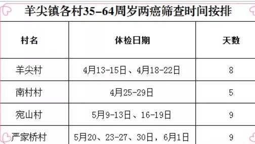 羊尖镇各村免费两癌筛查时间安排: