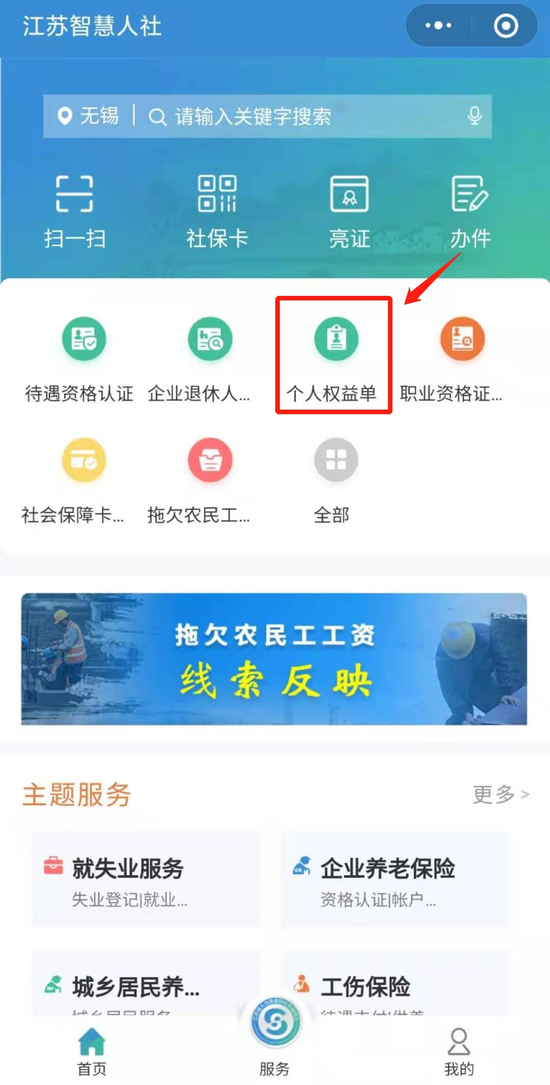 第一步,申请人登录手机微信,关注“无锡人社”微信公众号,点击“微人社”进入“人社服务”。