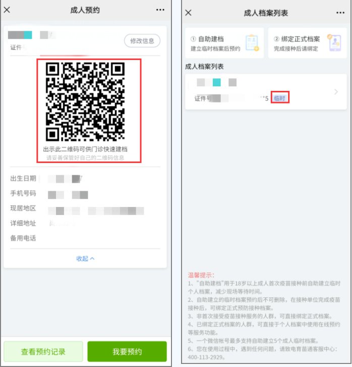 预约记录与接种记录查询:可在“成人档案列表”处,查询自己的预约记录或取消预约。预约受理通过后,请保存好个人二维码,在约定时间前往接种点,出示此码,配合接种医生,完成新冠疫苗接种。接种后,接种记录也会在此处同步显示。