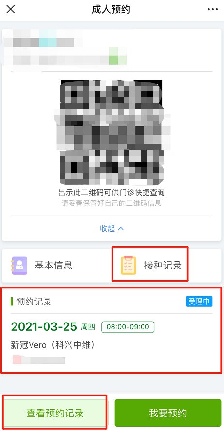 可在第4步“成人档案列表”处,查询自己的预约记录或取消预约。预约受理通过后,请保存好个人二维码,在约定时间前往接种点,出示此码,配合接种医生,完成新冠疫苗接种。接种后,接种记录也会在此处同步显示。