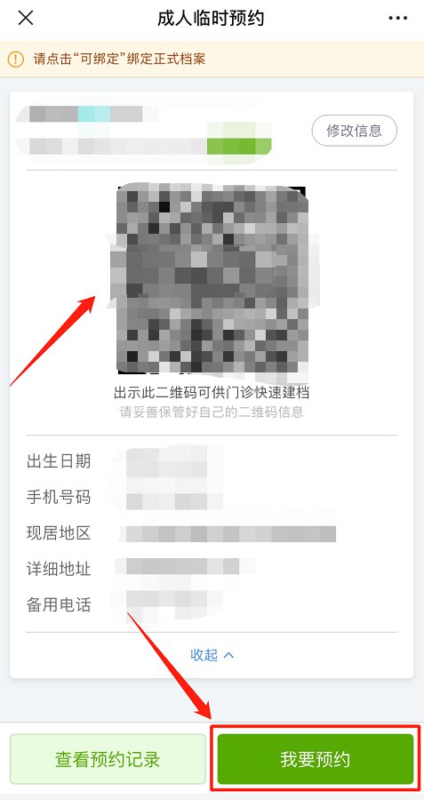 自助建档成功或绑定正式档案后,“成人档案列表”栏会出现个人信息,点击进去,选择“我要预约”,进行预约登记。