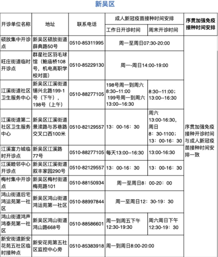 新吴区新冠病毒肺炎疫苗接种门诊一览表(无锡疾控2022年3月2日更新)