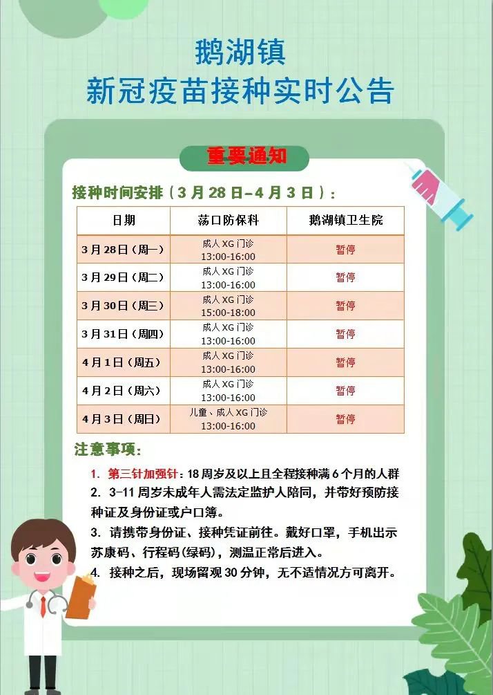 本周(3月28日-4月3日),鹅湖镇荡口防保科接种点正常接种,鹅湖镇卫生院接种点暂停接种。