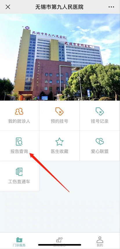 ②微信搜索【无锡市第九人民医院】在菜单栏点击【门诊服务】即可看到【报告查询】。