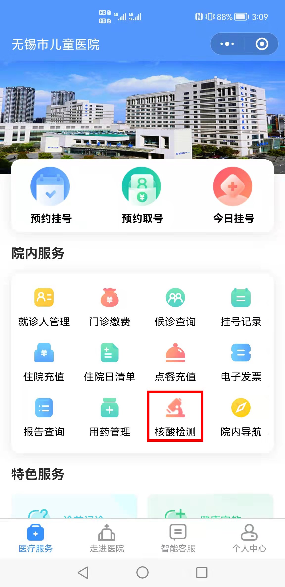 2、微信关注“无锡市儿童医院”,进入公众号点击菜单来的【诊疗服务】进入诊疗服务界面,并实名注册,在主页面点击“核酸检测”。挂号成功后缴费;