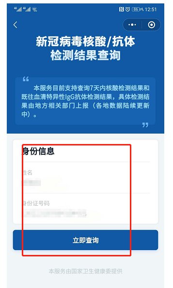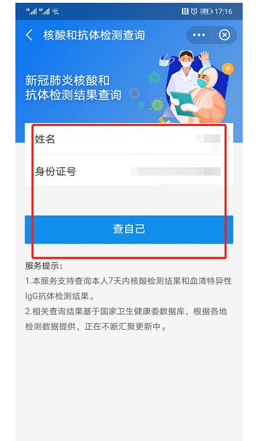 二、无需纸质报告的患者,请打开您的支付宝,搜索“国家政务服务平台”,进入系统查“核酸和抗体检测查询”,输入姓名、身份证号后点击“查自己”。检验时间、结果、检测机构信息自动显示。