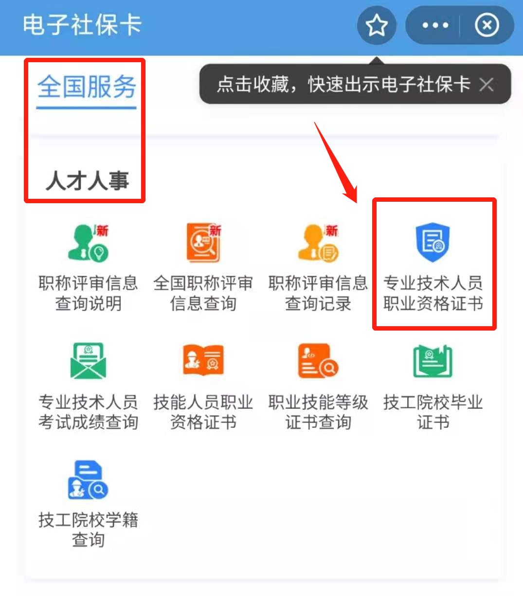 已经申领电子社保卡的个人,在电子社保卡服务页面,点击“全国服务”—“专业技术人员职业资格证书”、“技能人员职业资格证书”(如果首页看不到,可以点击“更多”后在“人才人事”分类中找到),不用再输入任何信息即可查询证书信息,高效便捷。