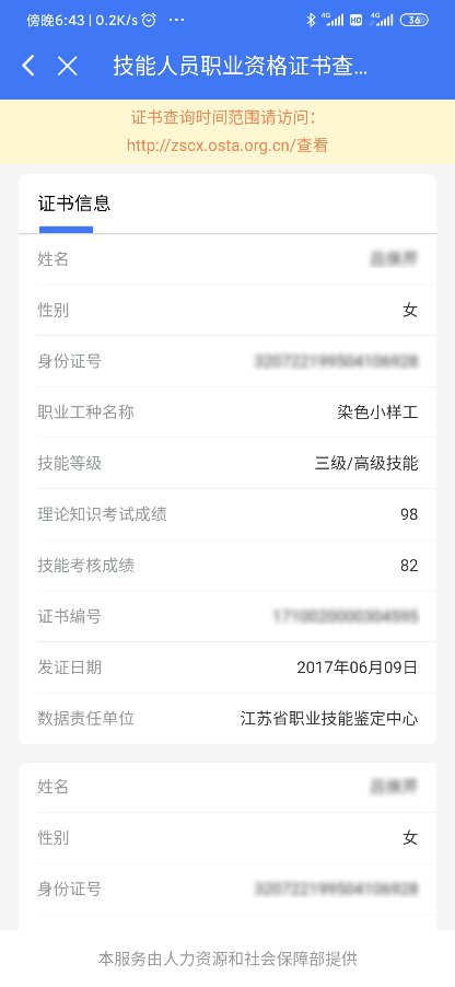 2、技能人员职业资格证书查询由人力资源社会保障部职业技能鉴定中心提供服务,个人可访问国家职业资格证书全国联网查询网站(http://zscx.osta.org.cn/)进行查询。