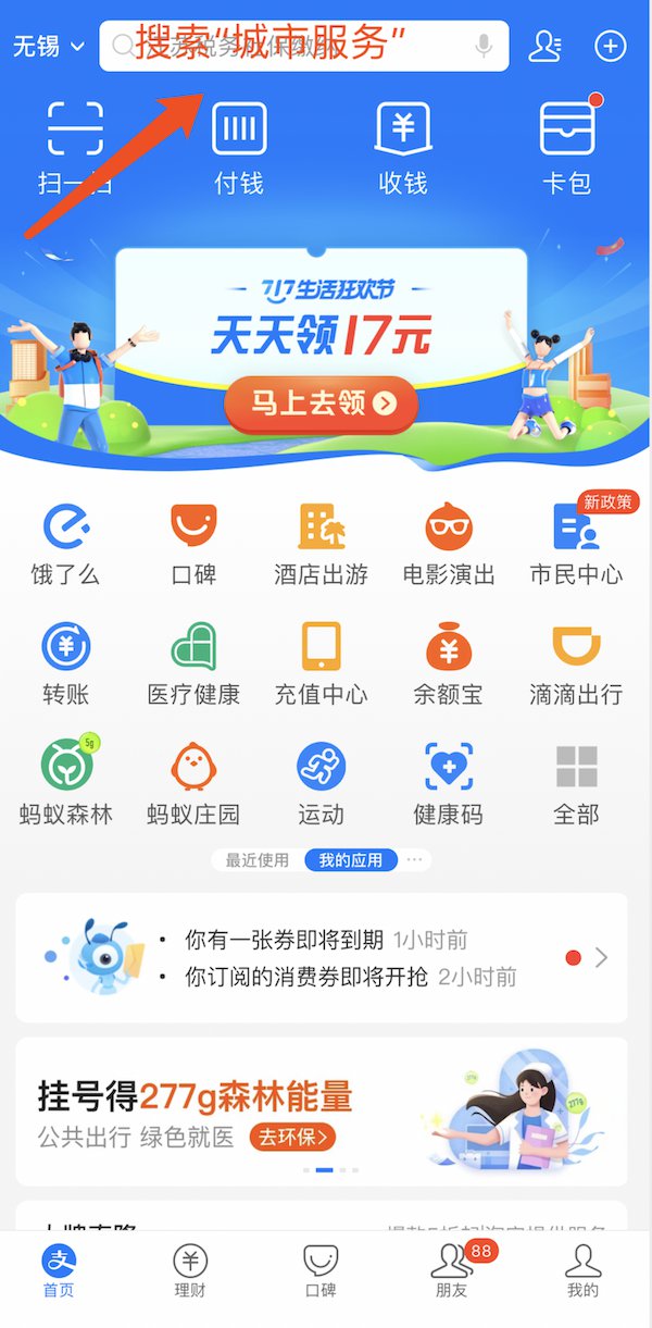 第一步:在“支付宝”平台搜索栏搜索“城市服务”