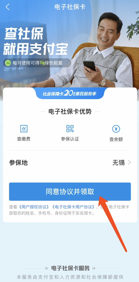 第四步:选择参保地点,点击“同意协议并领取”,然后进行身份验证即可获得无锡电子社保卡。