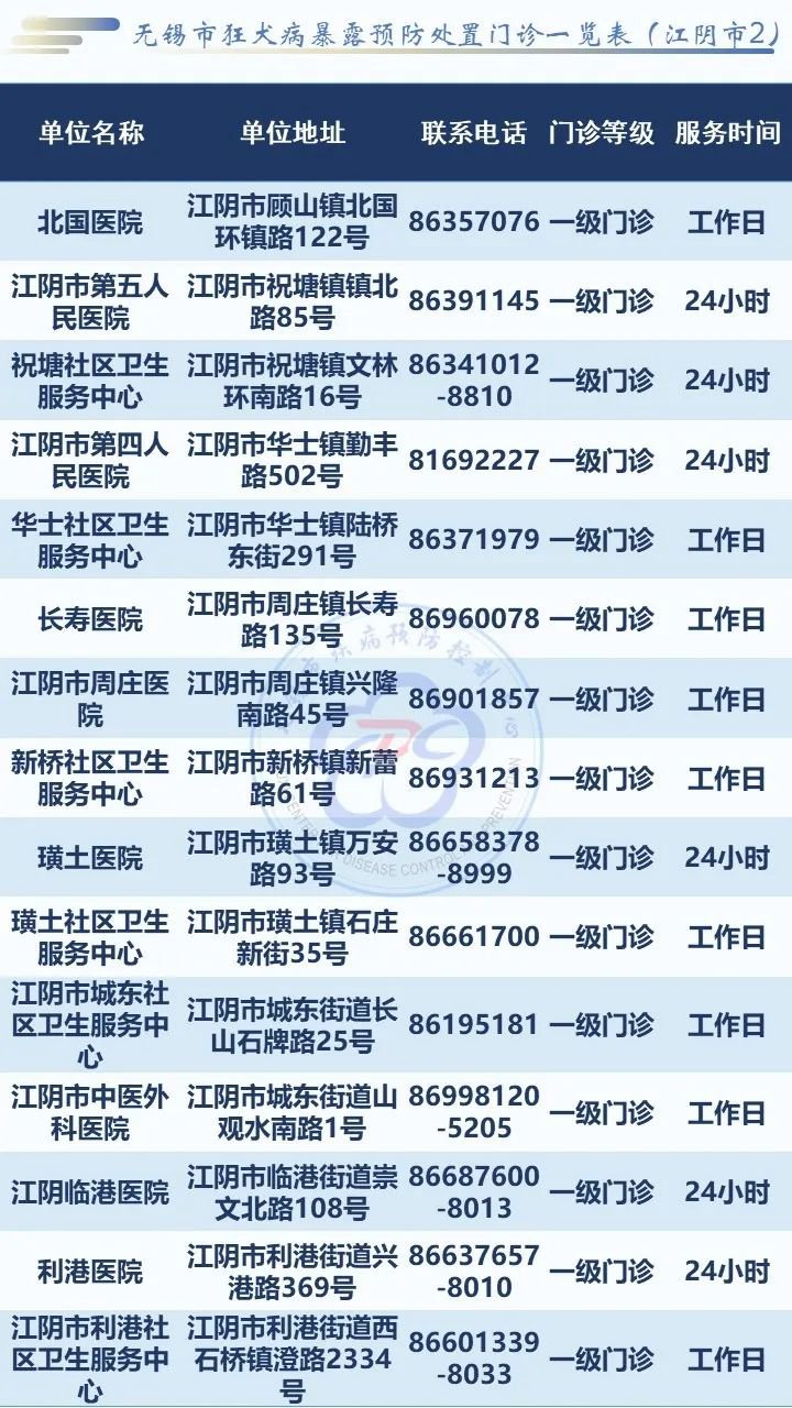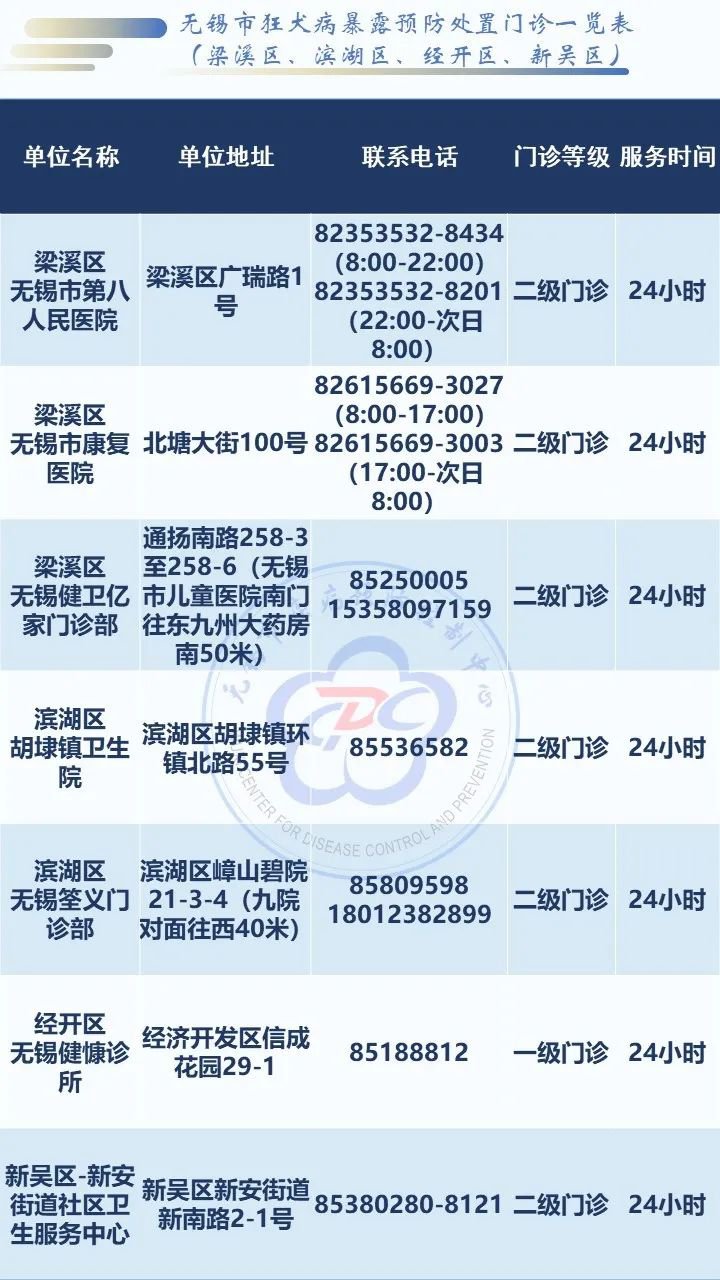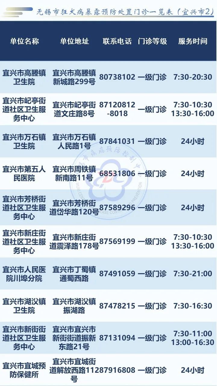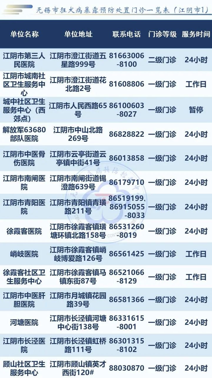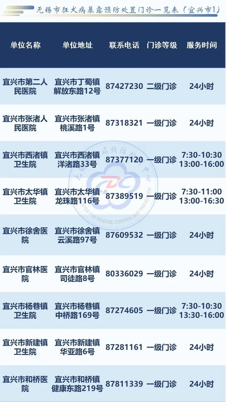 无锡锡山区狂犬病暴露预防处置门诊一览表