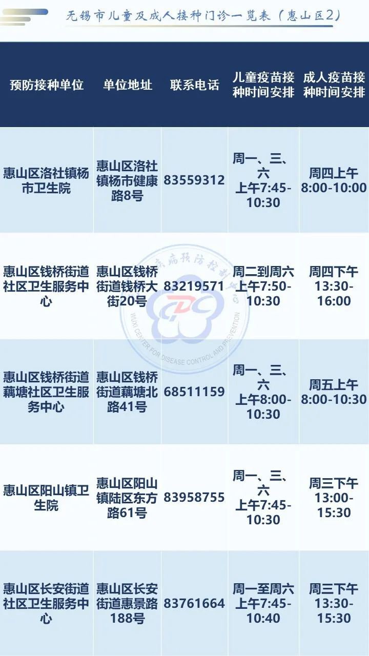 无锡市惠山区疫苗接种门诊一览表