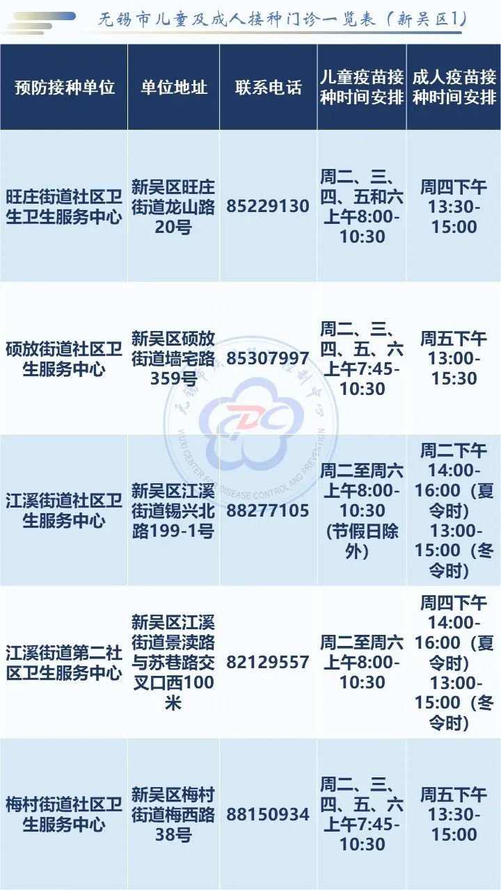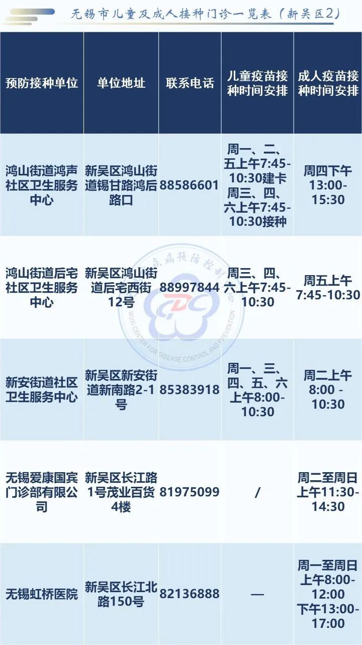 无锡市新吴区疫苗接种门诊一览表